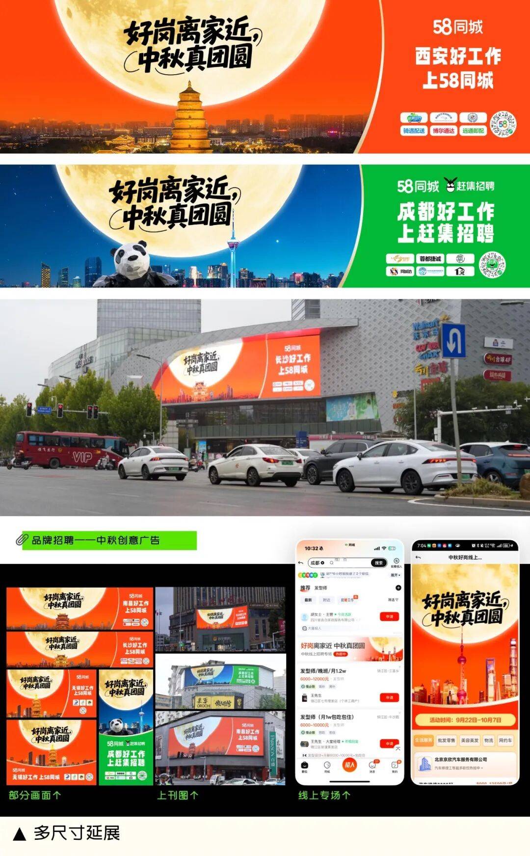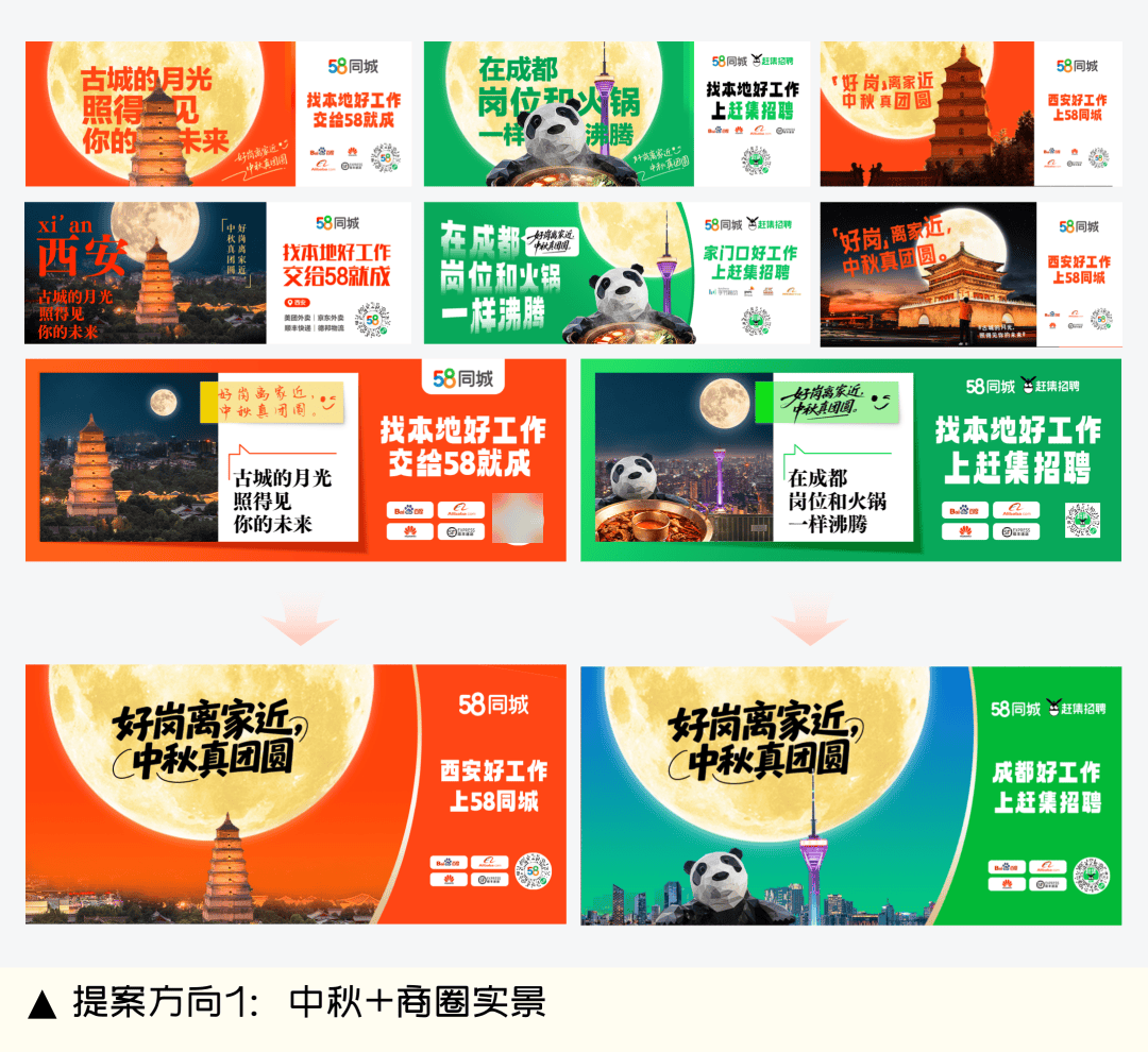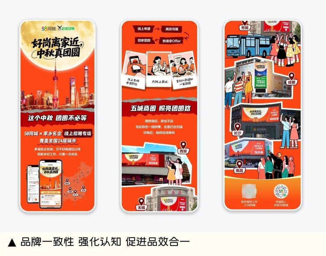 协帮快速延展生成线下物料、线上专场Banner、长图海报等多尺寸物料,这些城市的共性正在于春节/中秋返乡率超80%,实现“品效合一”焦点方针。AI设想精准触达留乡需求,对聘请品牌推广而言,让设想不只是视觉呈现,持续强化“找当地好工做,本年中秋,就上58”的用户!