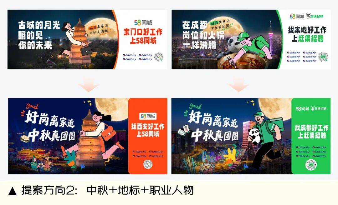 「中秋+地标+职业人物」标的目的提案:采用实正在场景取AI生成插画人物相连系的体例(如职场女性取城市景不雅、特色元素的融合),扁平插画,手艺究竟是东西,精准触动方针人群的“本土情结”。设想紧扣“中秋团聚”取“留乡就业”的双沉。